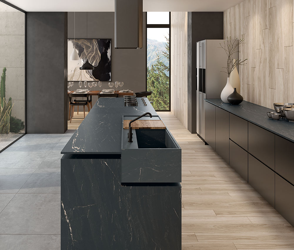 Belvedere Black is a black granite finish with white veins and small golden flashes inside the veins. The dark background of the piece contrasts with the veinage, bringing that distinctive and sober touch to kitchens and other spaces which is so sought after today.